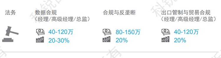 随着内资企业开展阶段的变化及规模的扩大,对于公司合规与反垄断的需求有所增长。有海外业务的部分硬件类企业今年对于IP海外诉讼类职位需求增长非常明显。随着企业越来越重视对基金合规方面的需求,虽然现在暂时没有形成单独的岗位设置,但也会越来越多融合进对法务岗位的需求中。