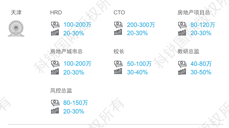 天津整体薪资呈现上涨的趋势,尤其金融、教育、高科技等行业,核心岗位如在线教育的教学教研岗、AI算法、底层开发架构等岗位跳槽涨幅可达30-50%。本数据来源于猎头公司Ezpay钱包国际资深行业专家对2021年热门职位薪酬范围及跳槽涨幅的预测,供HR和猎头招聘参考。