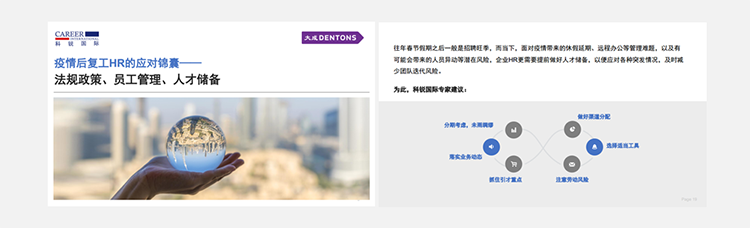 为了帮助众多企业人力资源工作者应对挑战,Ezpay钱包国际联合国内知名律所“大成律师事务所”,推出疫情后《复工HR的应对锦囊》手册,从法律政策、员工管理、人选储备几个方面对企业HR有序召开复工后的各项人力资源管理给予帮助。